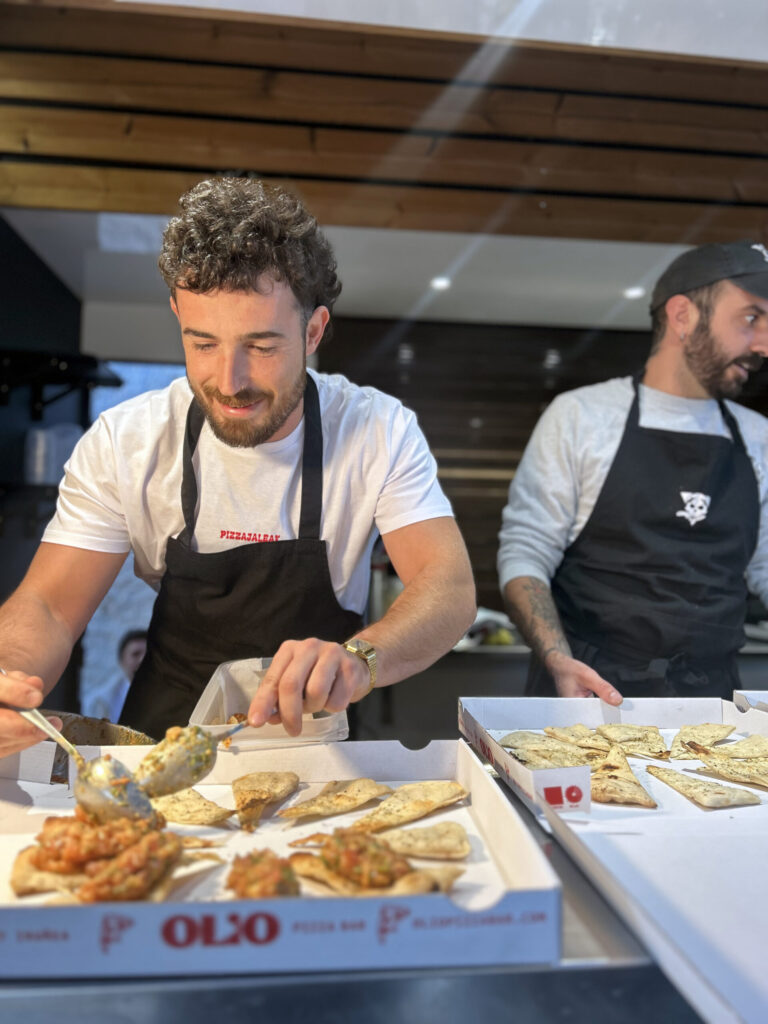 Julen Fernández y Julen Urtasun, de Olio Pizza Bar en Pamplona/Iruña, se han encontrado con Bordaxaki de Ochagavía, proyecto de Iñaki Zoko y Andoni Arizkuren dedicado a la cría y producción del Euskal Txerri. De esta colaboración nace el ‘Tartar de euskaltxerri sobre base de pizza al horno de piedra’, una elaboración que combina solomillo en tartar, chicharrones aliñados con pimentón ahumado y vinagre en polvo sobre una masa artesana horneada en piedra.