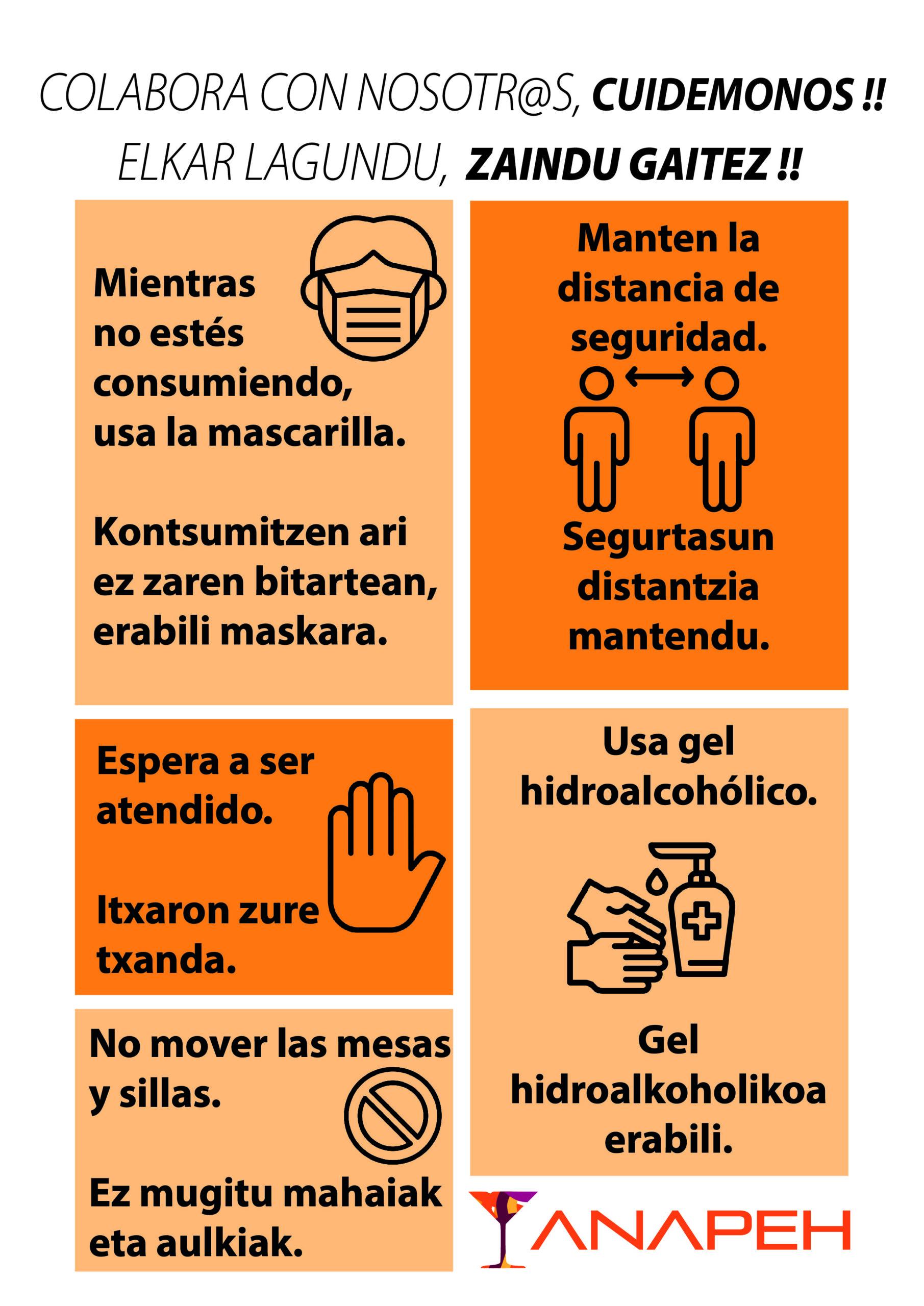 A estas alturas y sabiendo que nuevos picos y olas pandémicas se reflejarán en nuevos cierres y medidas más restrictivas, siguiendo la tendencia de las diferentes instituciones de culpabilizar al sector, ANAPEH quiere lanzar un mensaje de responsabilidad tanto a las personas hosteleras como a al público usuario de los locales hosteleros para que no se relajen y cumplan a rajatabla todos los protocolos de seguridad.